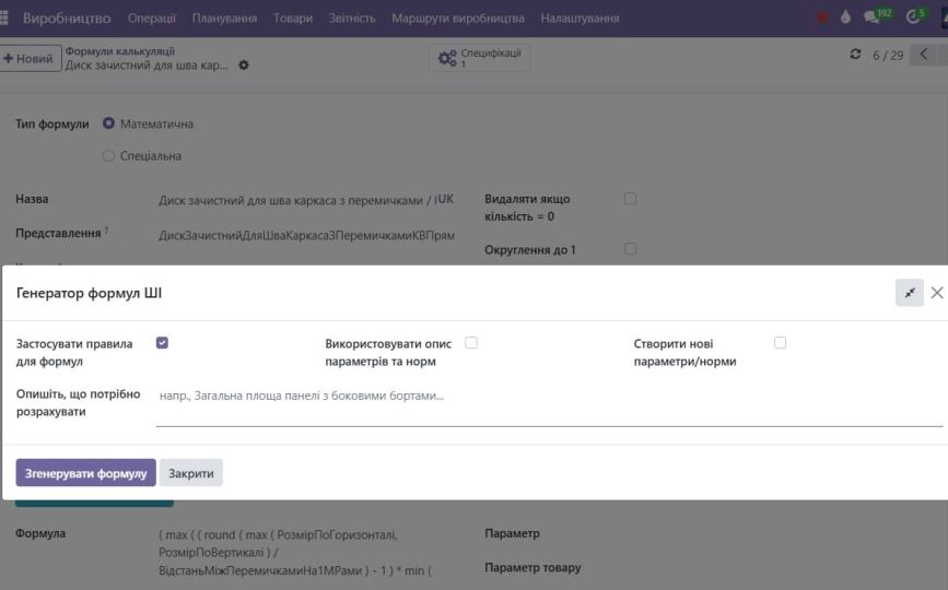 Тепер не потрібно прописувати математичні формули вручну або працювати з їхнім синтаксисом. Ви описуєте, що саме потрібно порахувати, і система одразу формує формулу, використовуючи параметри, які вже є у вашій моделі виробництва Це дозволяє уникнути типових помилок у змінних і прибирає технічний бар’єр між задачею і її реалізацією.